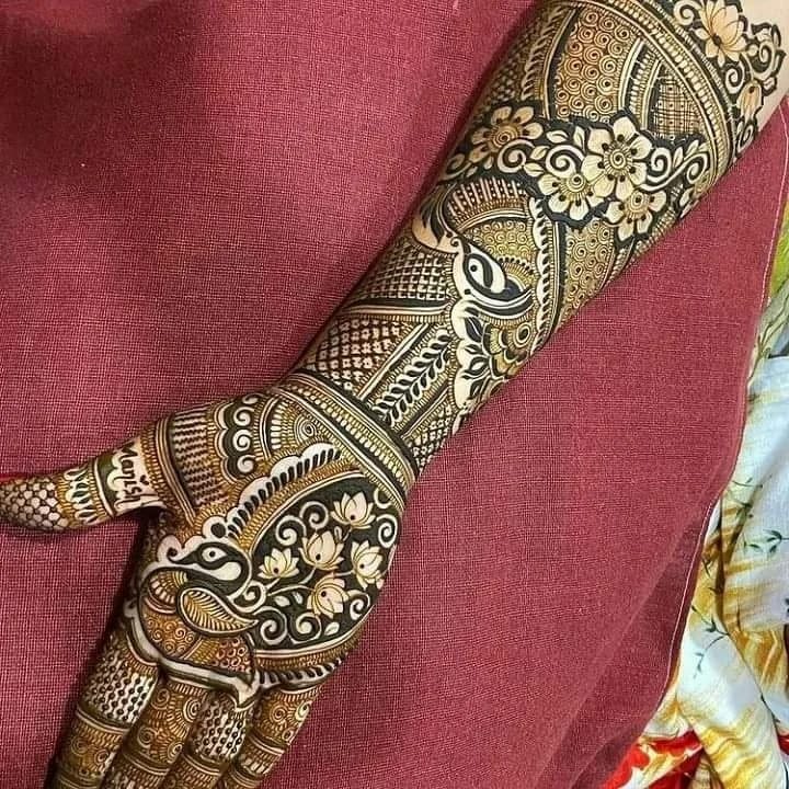 Gujarati mehndi patterns portray fabulous peacocks, leaves, flowers, and additional known trims.